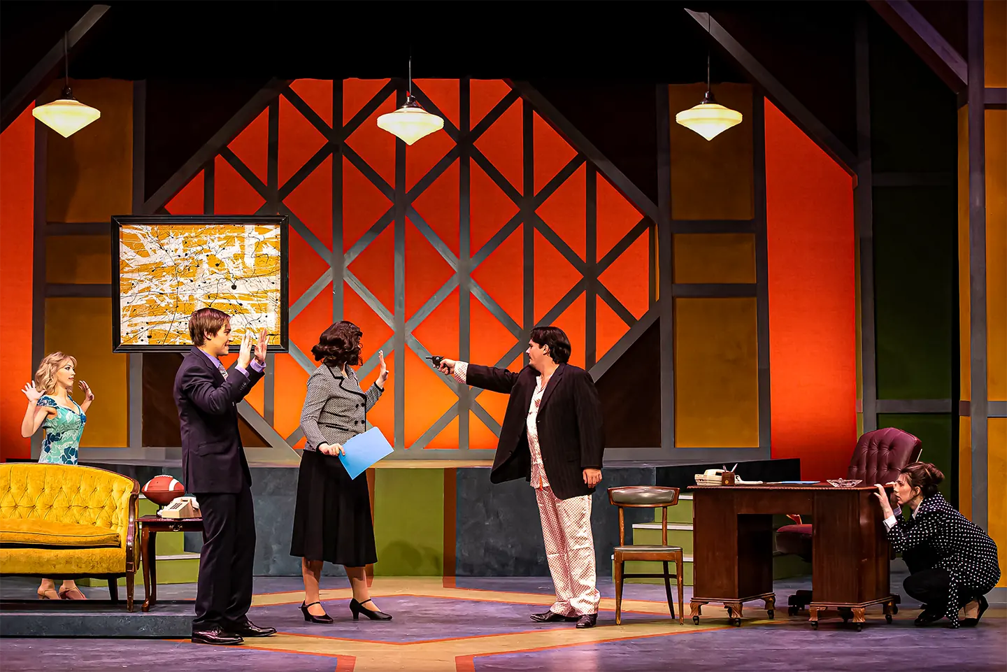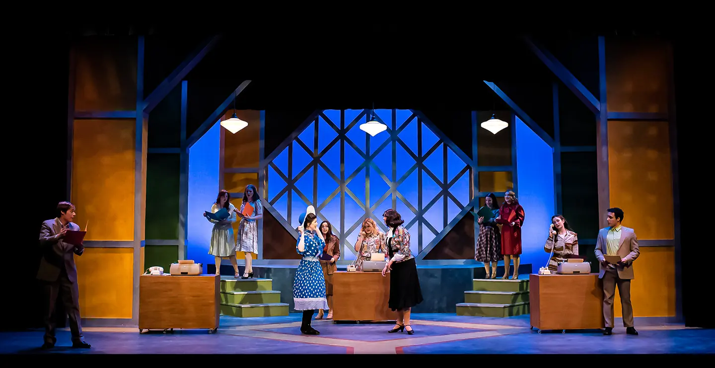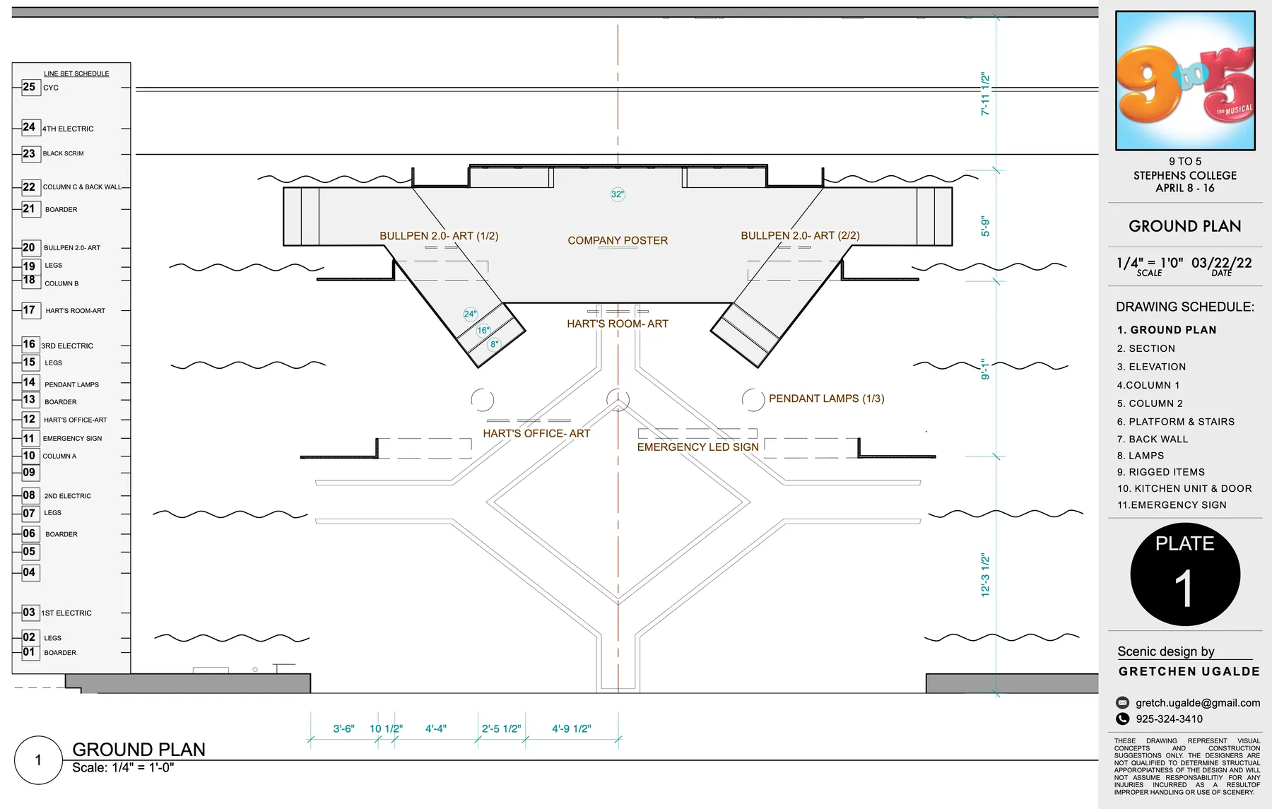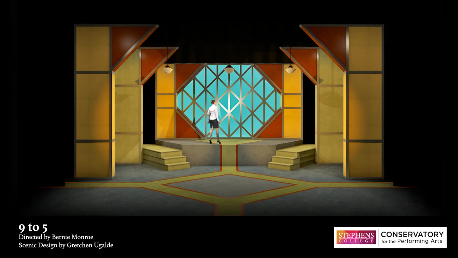 Scenic design archive for 9 to 5 at Stephens College, featuring Gretchen Ugalde's Vectorworks renderings, production photography, research, and drafting from the March 2022 production.