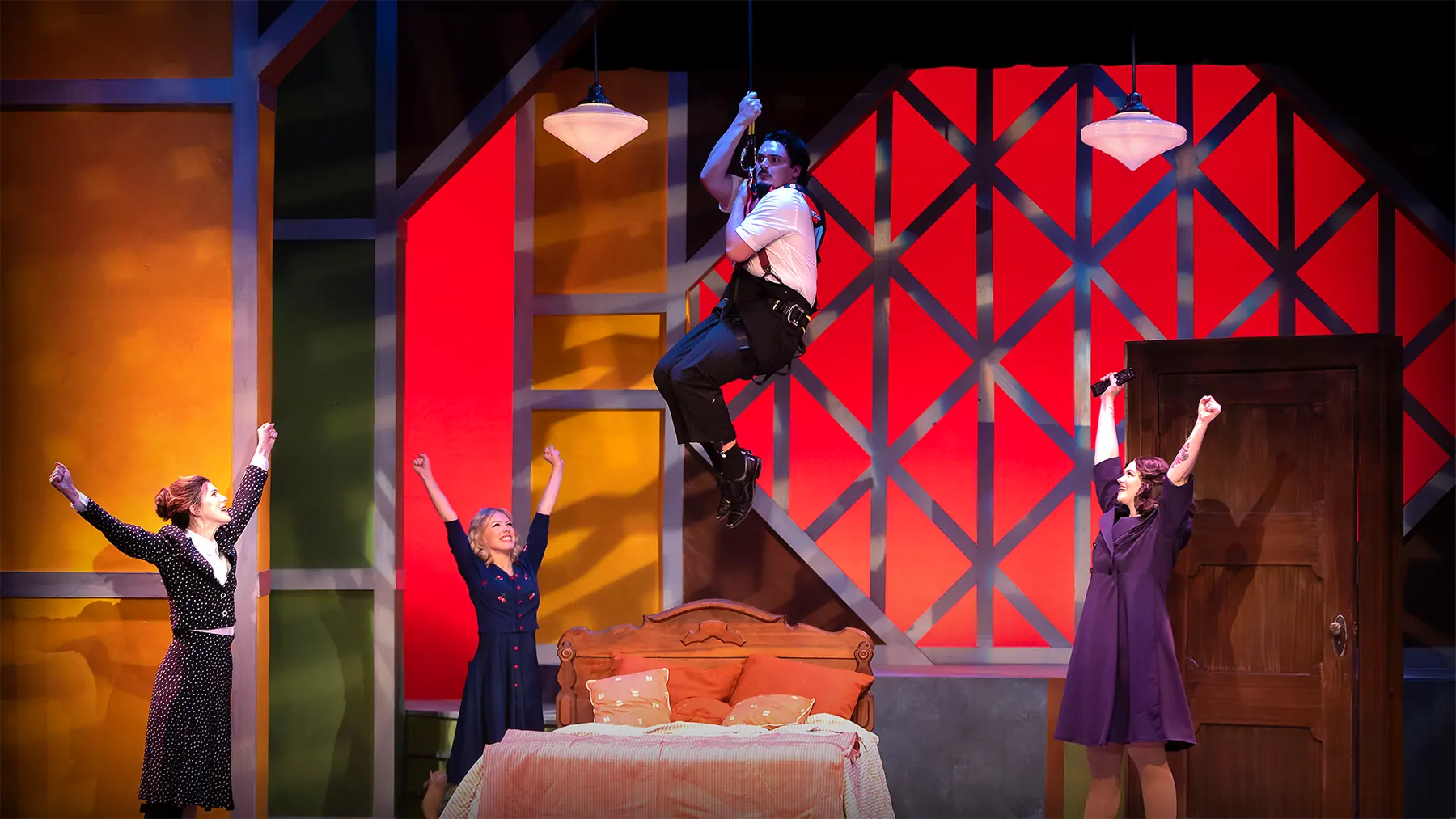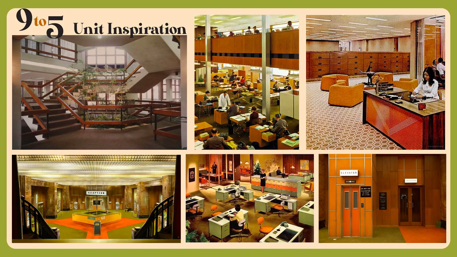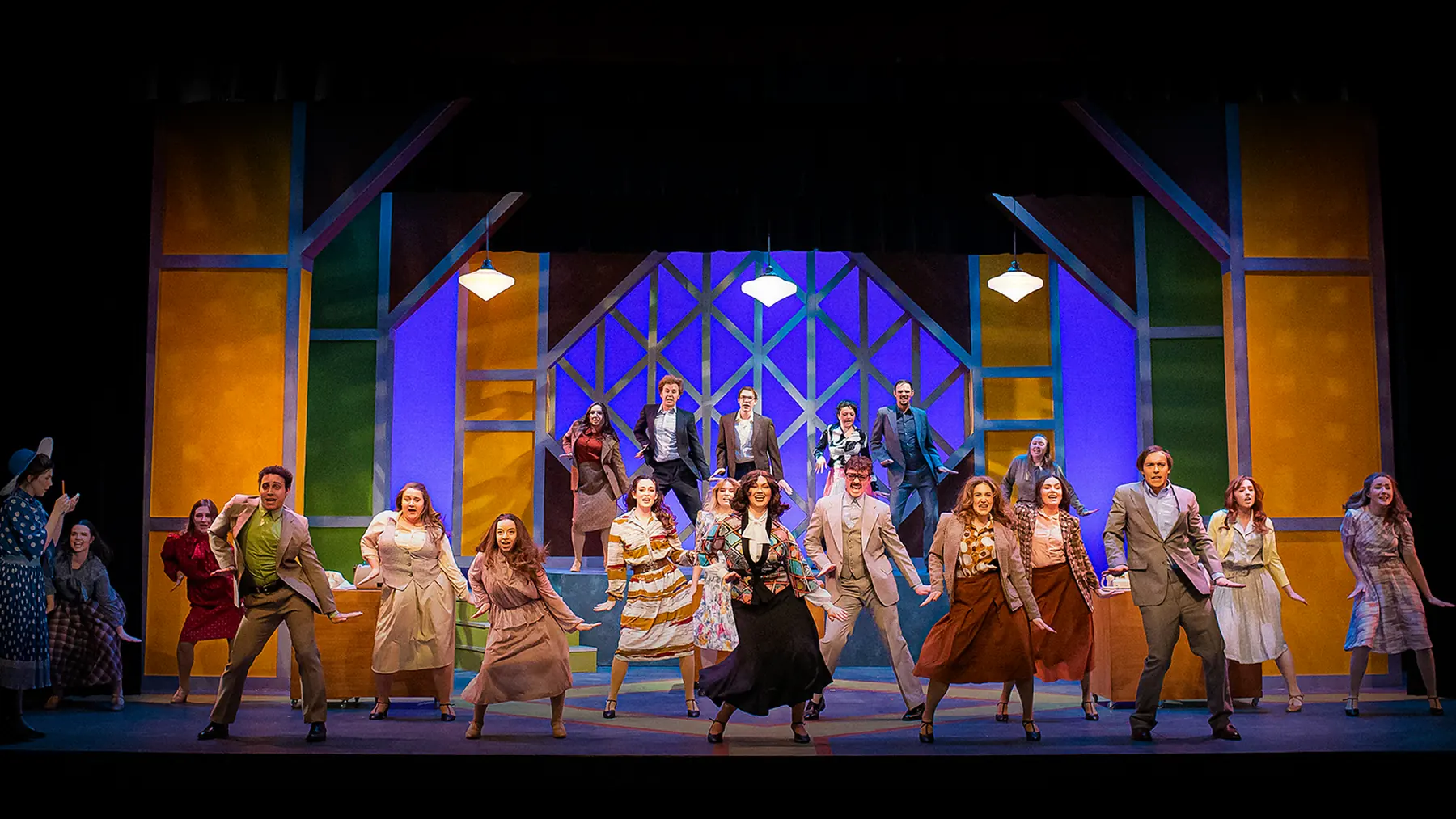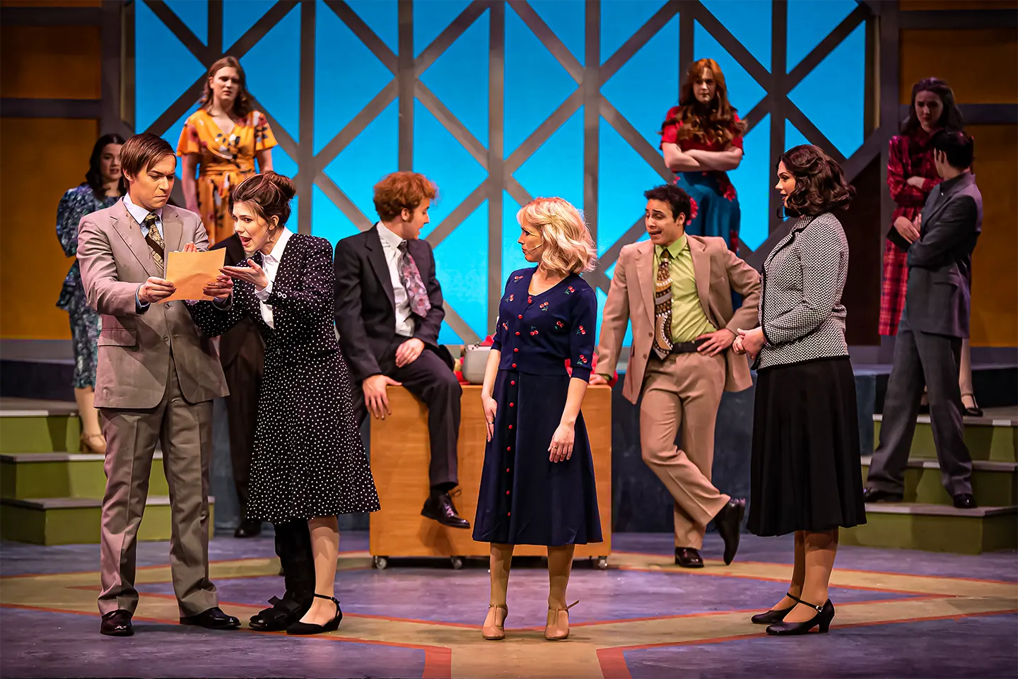 Scenic design archive for 9 to 5 at Stephens College, featuring Gretchen Ugalde's Vectorworks renderings, production photography, research, and drafting from the March 2022 production.
