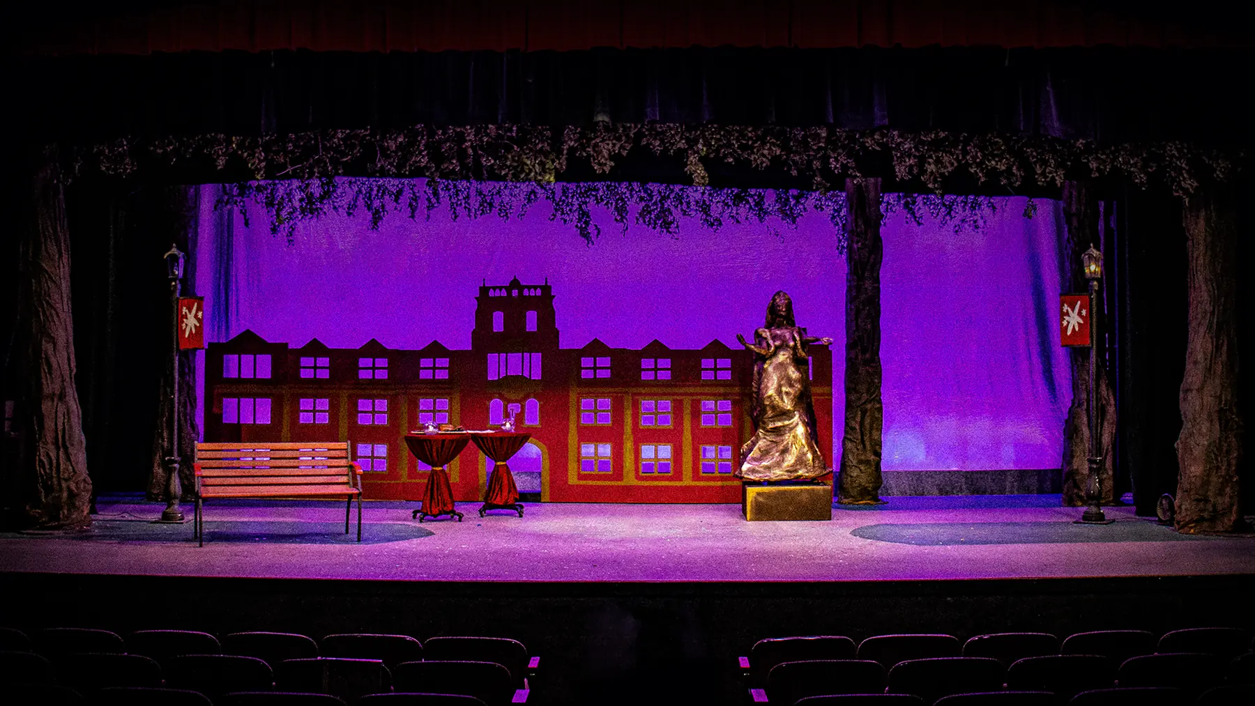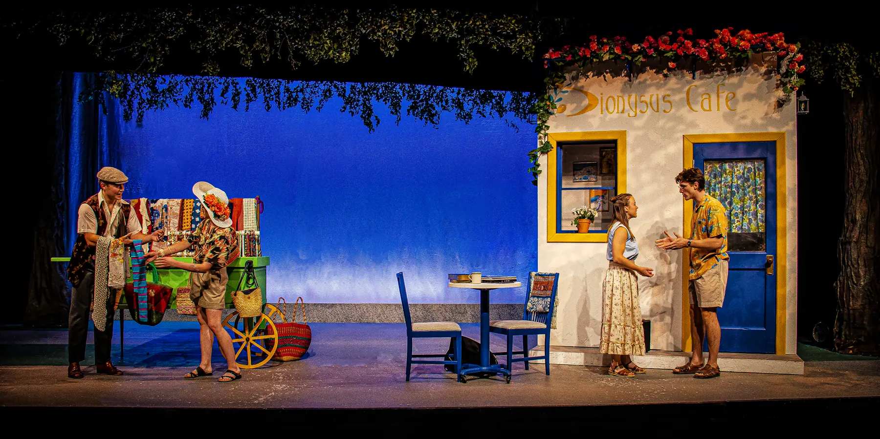 Three distinct scenes were created for this show, a street cafe on the Greek island of Naxos, a university professor's office, and a courtyard on the central campus. A canopy of trees and foliage borders unites all of these locations.