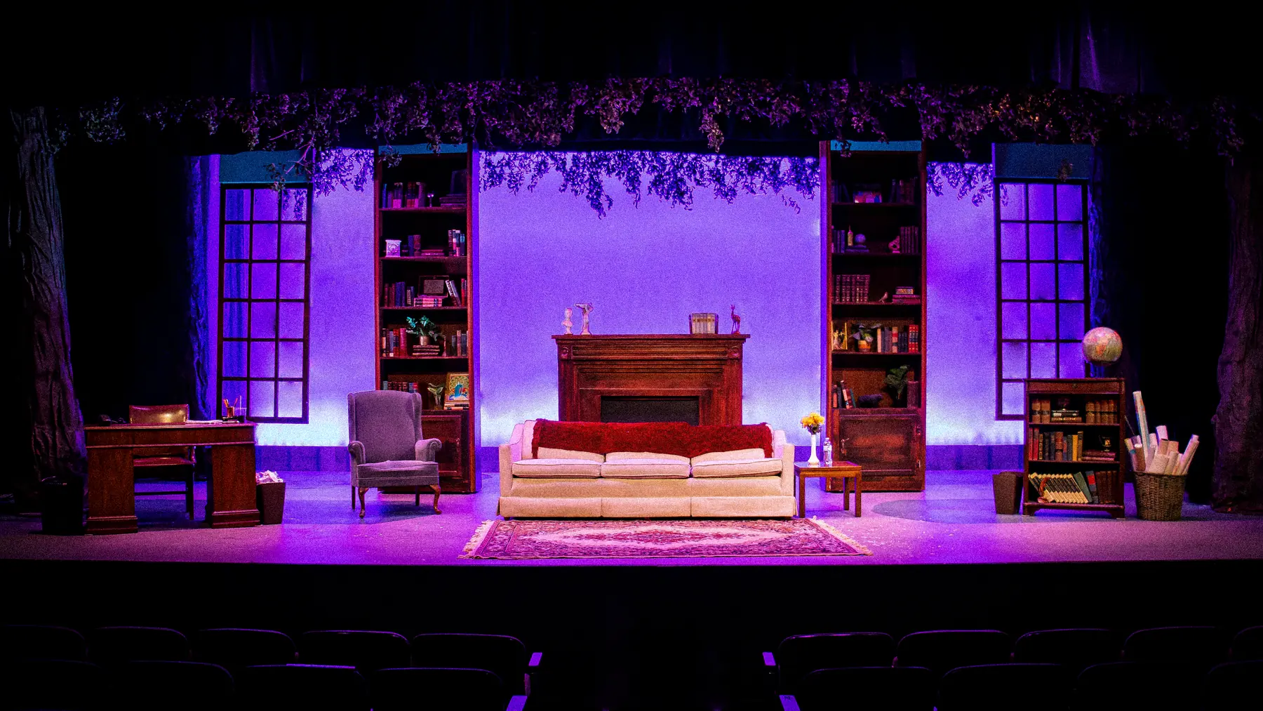 Gods of Comedy follows two classics professors on a chaotic search for a lost Euripides manuscript as divine intervention pushes their day further and further off course. Gretchen Ugalde's scenic design supports that comic momentum with three distinct locations unified by a canopy of trees and foliage that ties the world together.