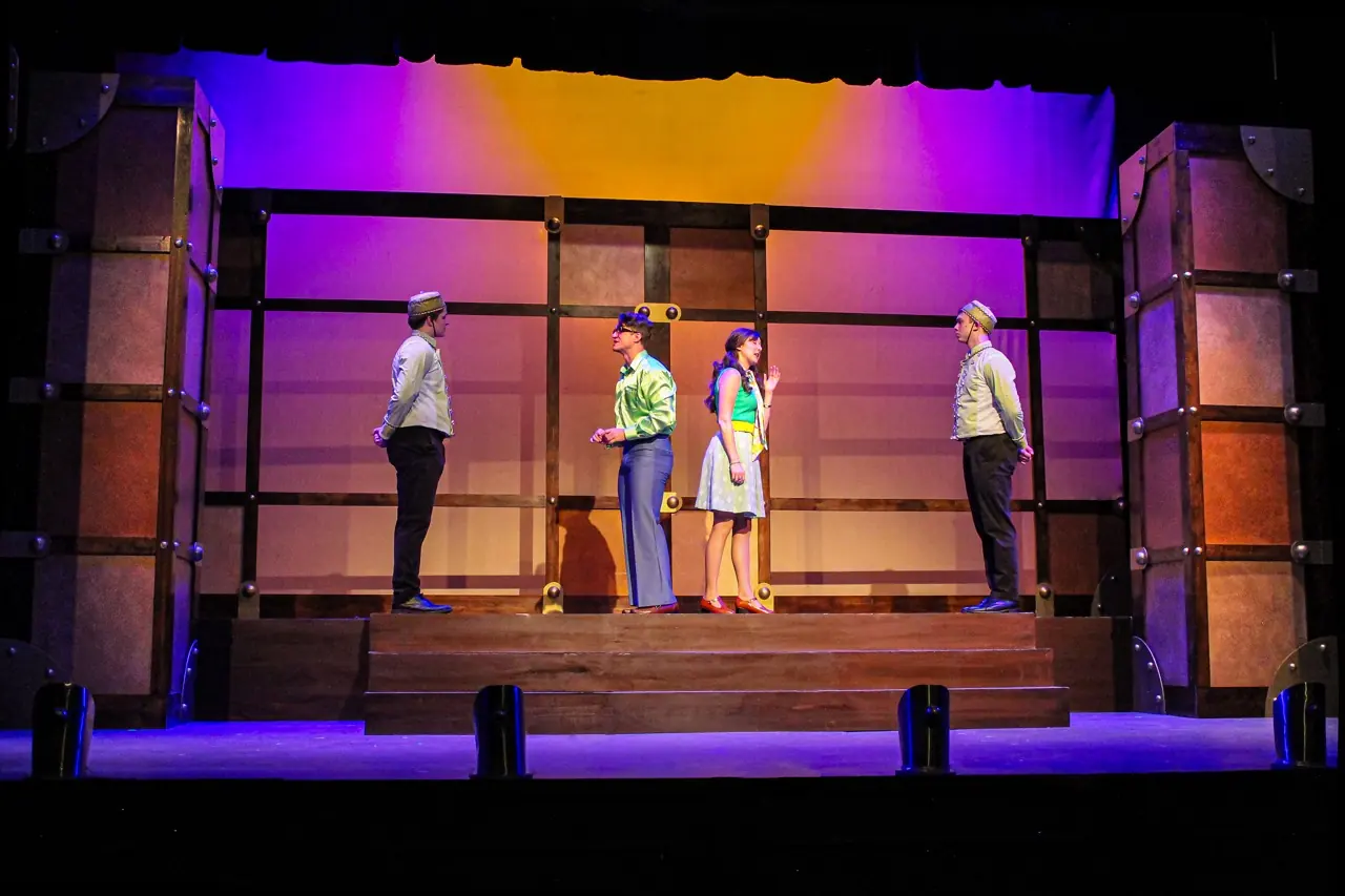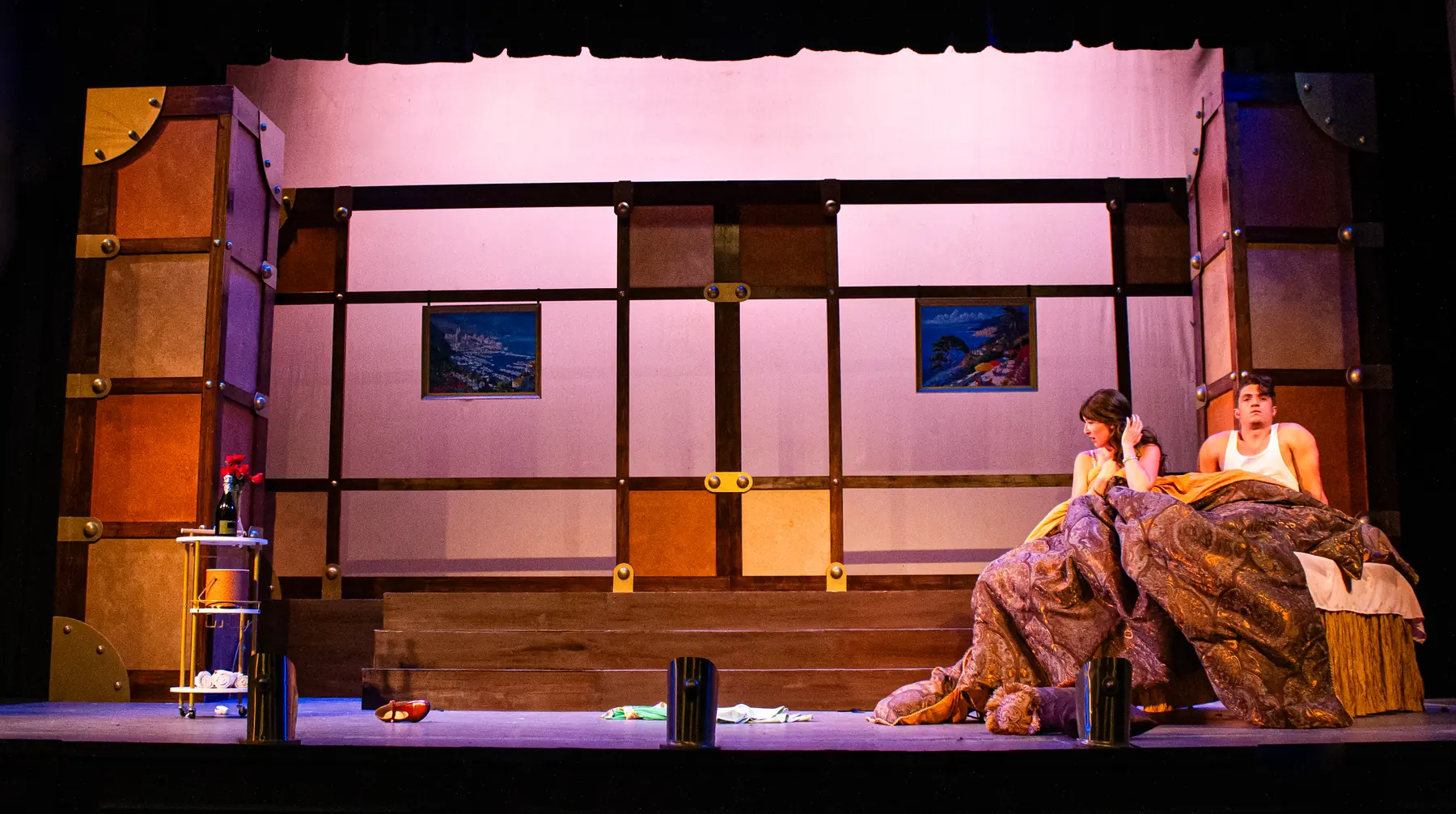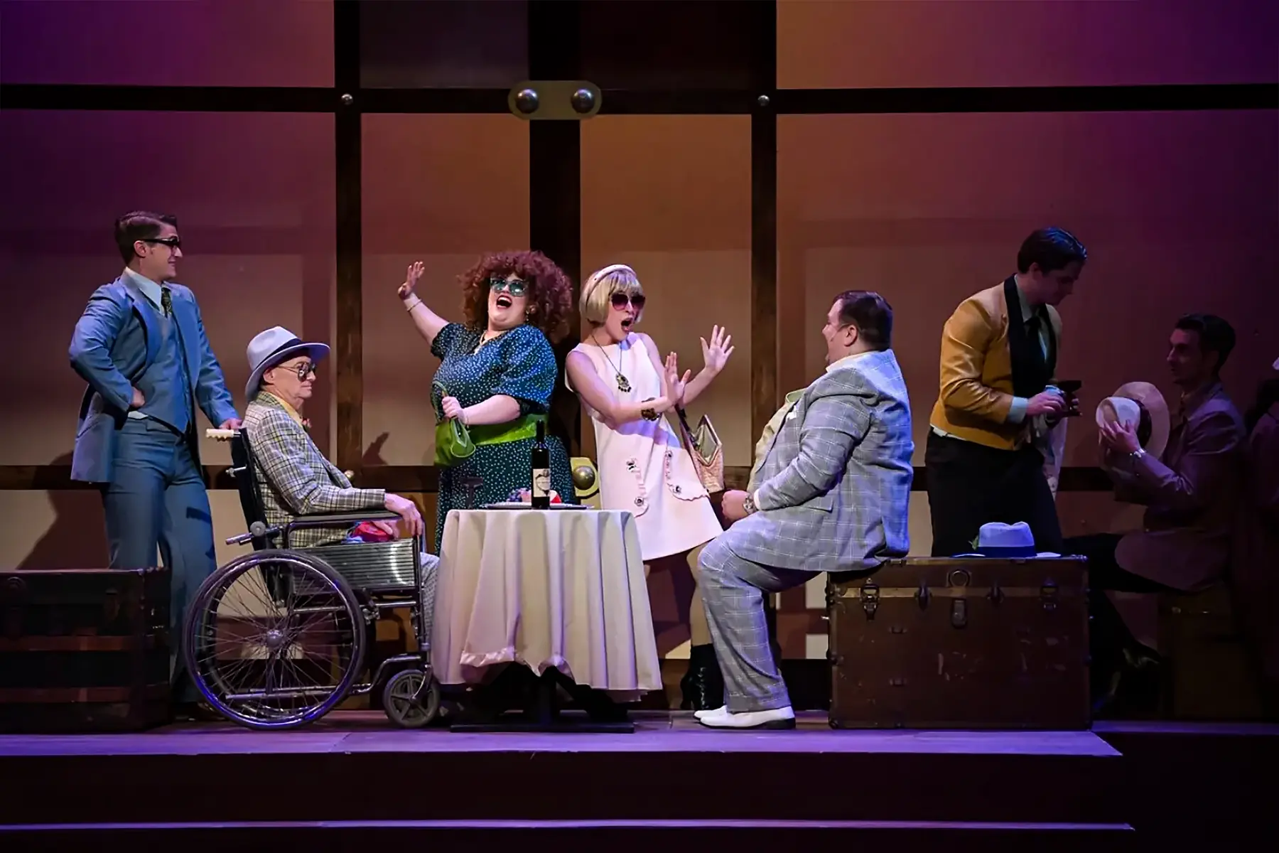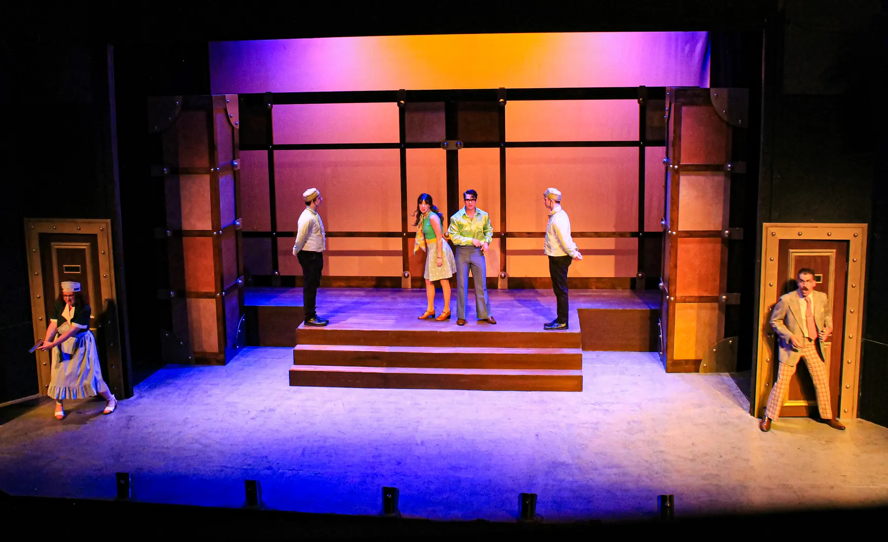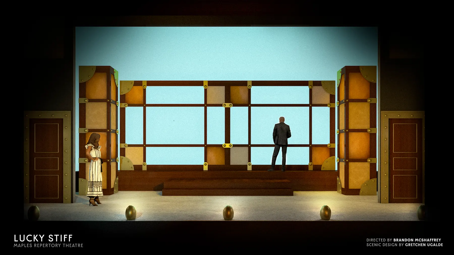 Lucky Stiff is a farcical musical comedy that moves through a heightened world of mistaken identities, inheritance schemes, and quick theatrical reversals. Gretchen Ugalde's design supports that fast-moving comic energy with a bright, adaptable environment that keeps the production nimble while still giving each scene a strong visual personality.
