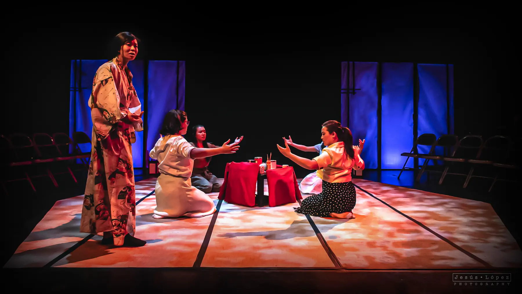 Velina Hasu Houston's play Tea follows five Japanese war brides who moved to Riley, Kansas after World War II. The balance of life in their small immigrant community is undone when Himiko dies by suicide, and her four friends gather to clean her house, mourn her death, and try to make sense of their own lives while her ghost remains among them.