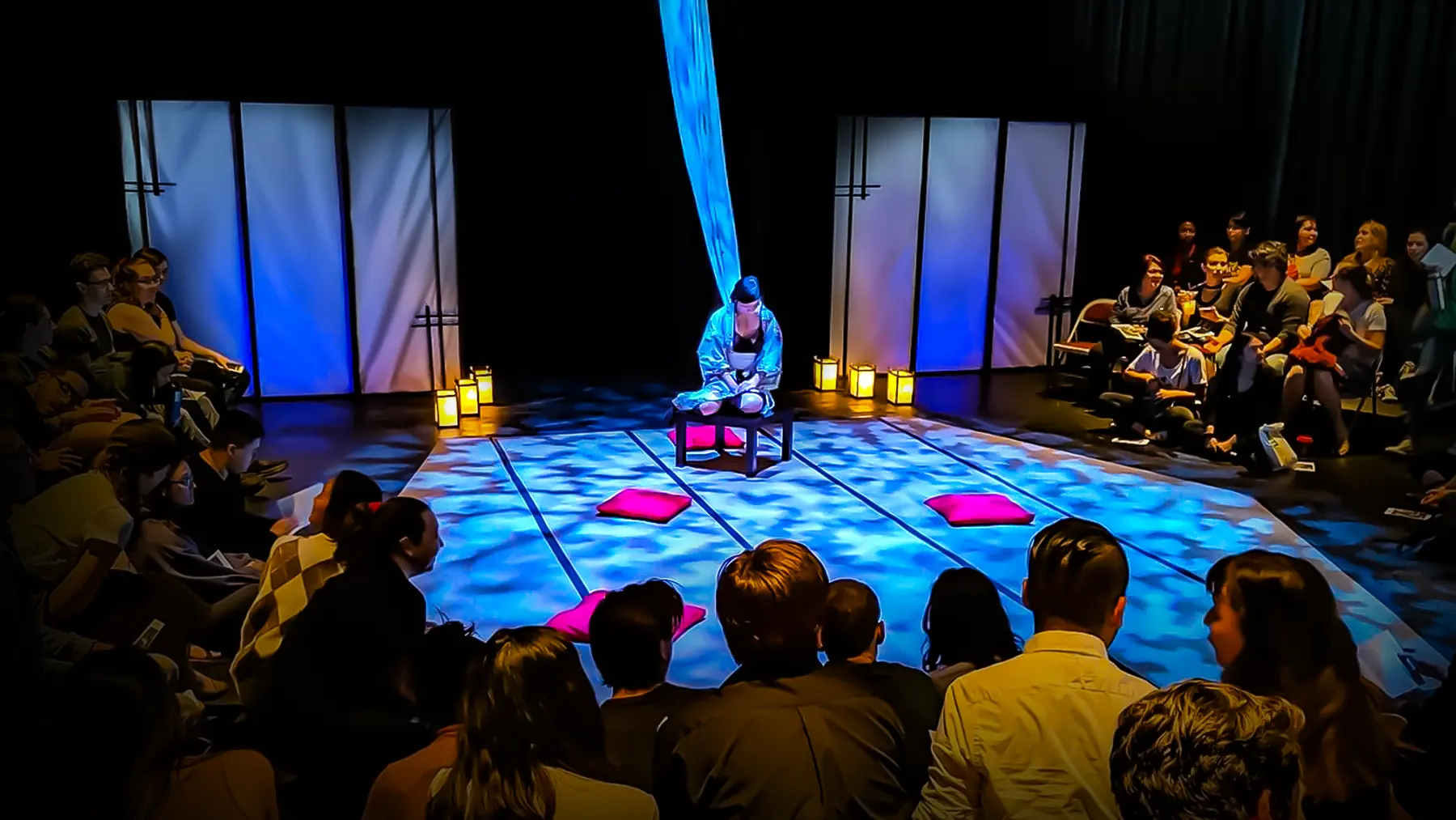 This set consisted of a hexagon-shaped tatami matt and shoji screens directly in front of each corner of the matt. The matt has 5 walkways, representing the lives of each woman in this story. The shoji screens surrounding the matt helped the production play with the theme of ghosts being among us as actors walked behind the screens.