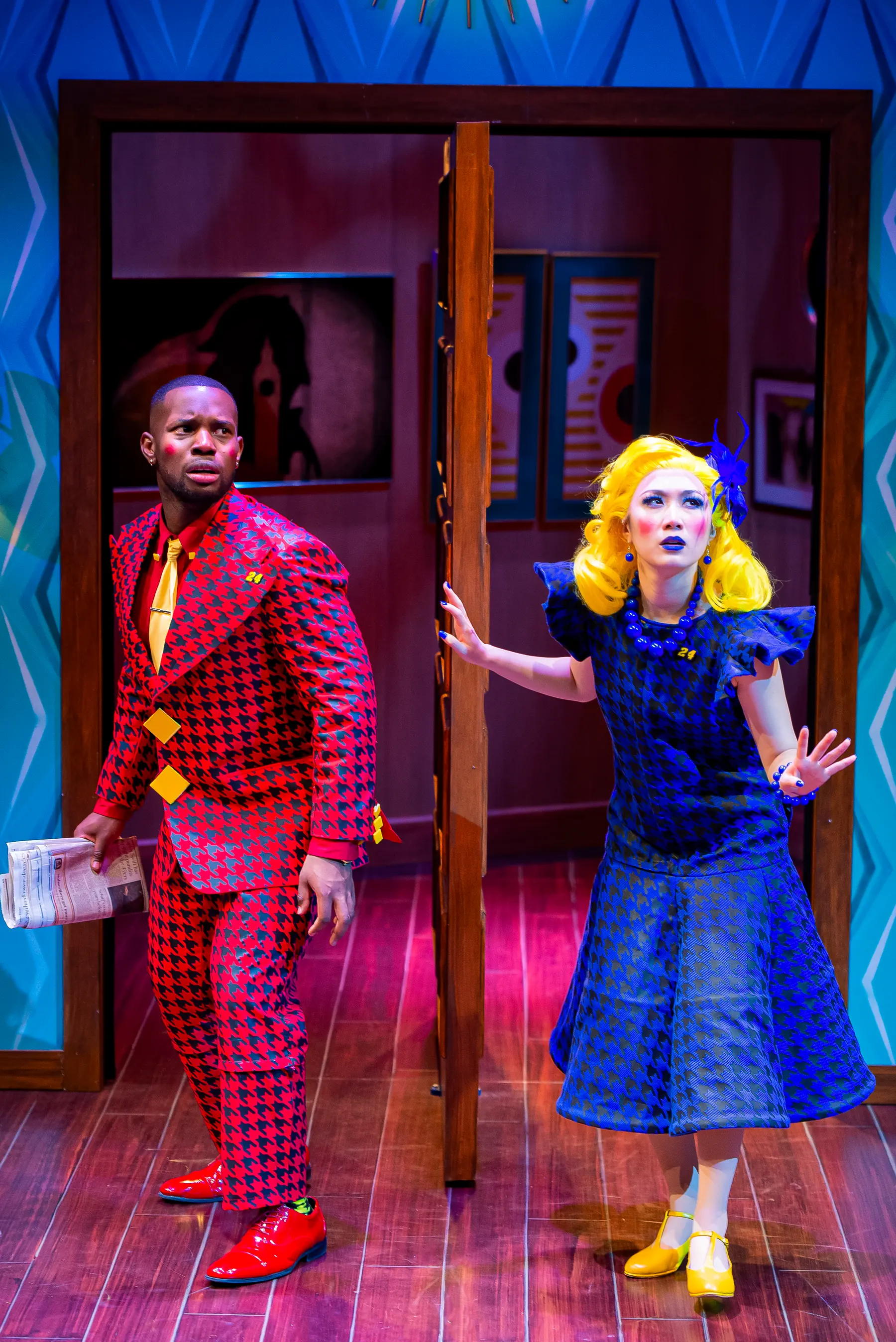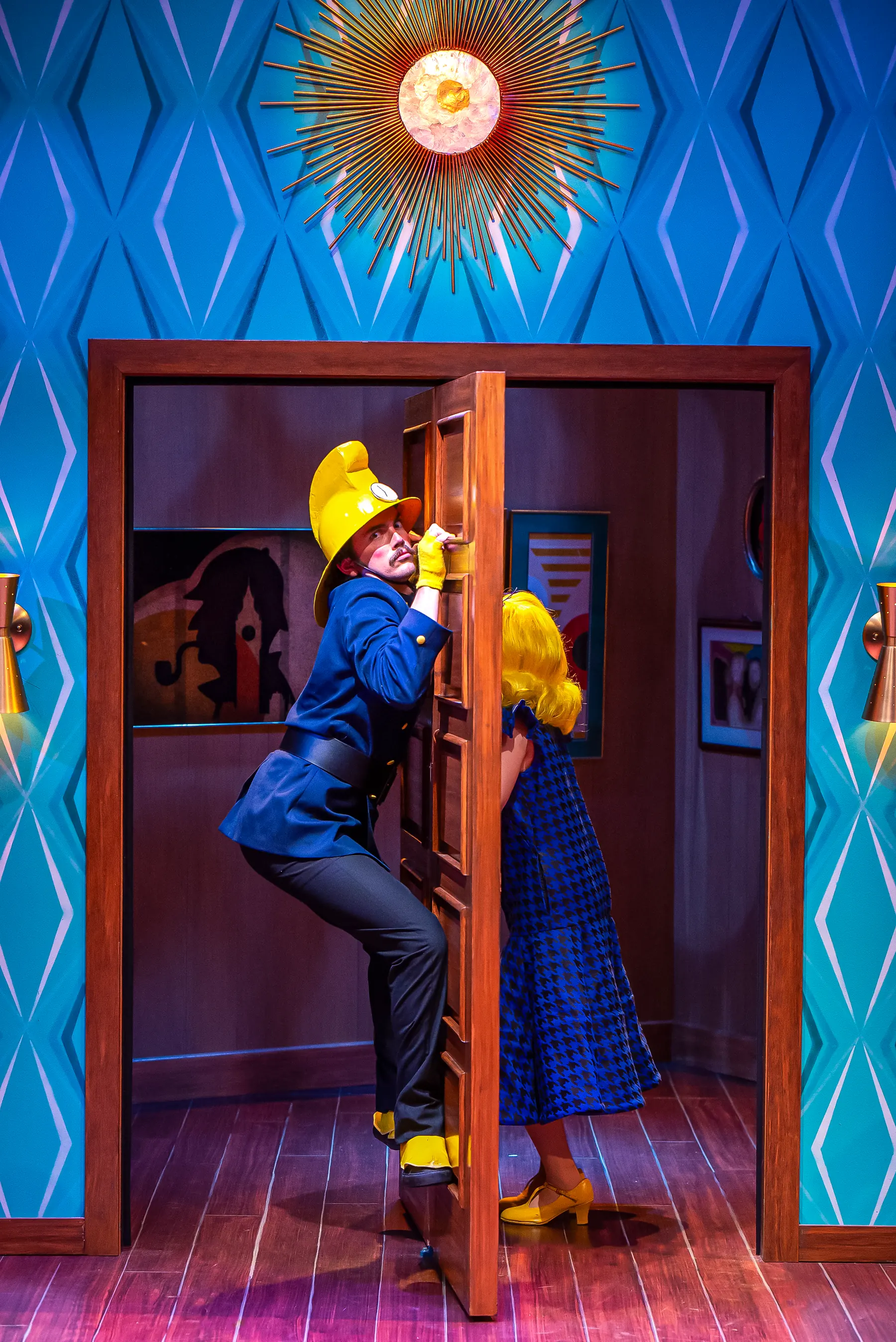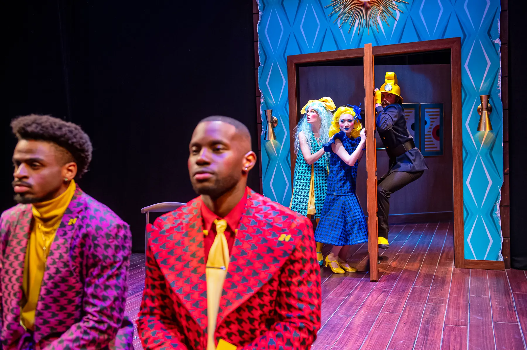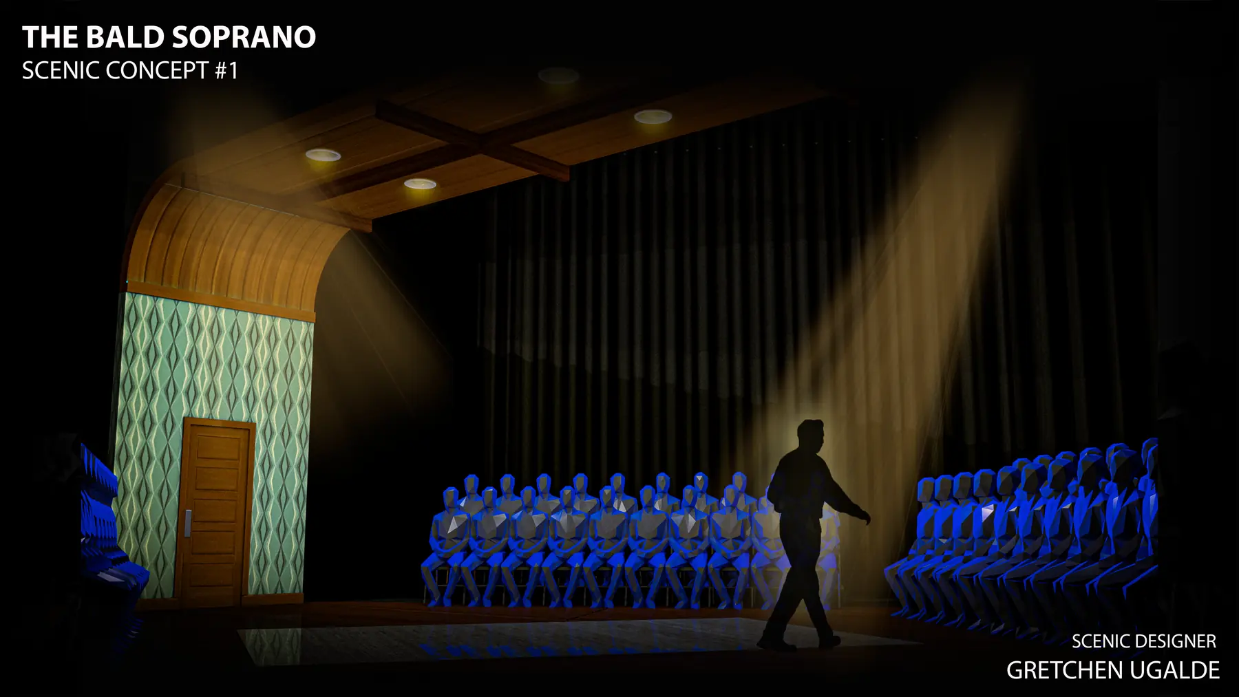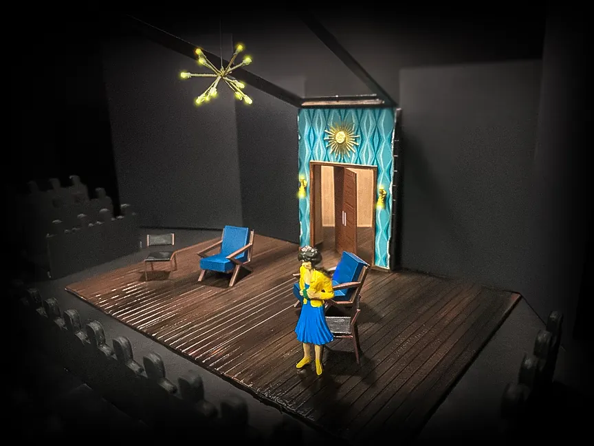 Drawing from the romantic art of Arthur Sarnoff, which embodies the essence of the American dream, this led me to design a set that appears to embody the perfect American dream, a mid-century modern living room, with its whimsical elements and bold patterns, symbolizing the idealized life the characters may aspire to. However, amidst this seemingly perfect setting, I incorporated elements of absurdity, such as the revolving door and the unusual clock, to foreshadow the chaos and confusion that lie beneath the surface of the characters' lives. My hope is that the audience will not only see the absurdity of the characters' lives but also reflect on the absurdity of their own, ultimately finding humor and humanity in the shared experience of the human condition.