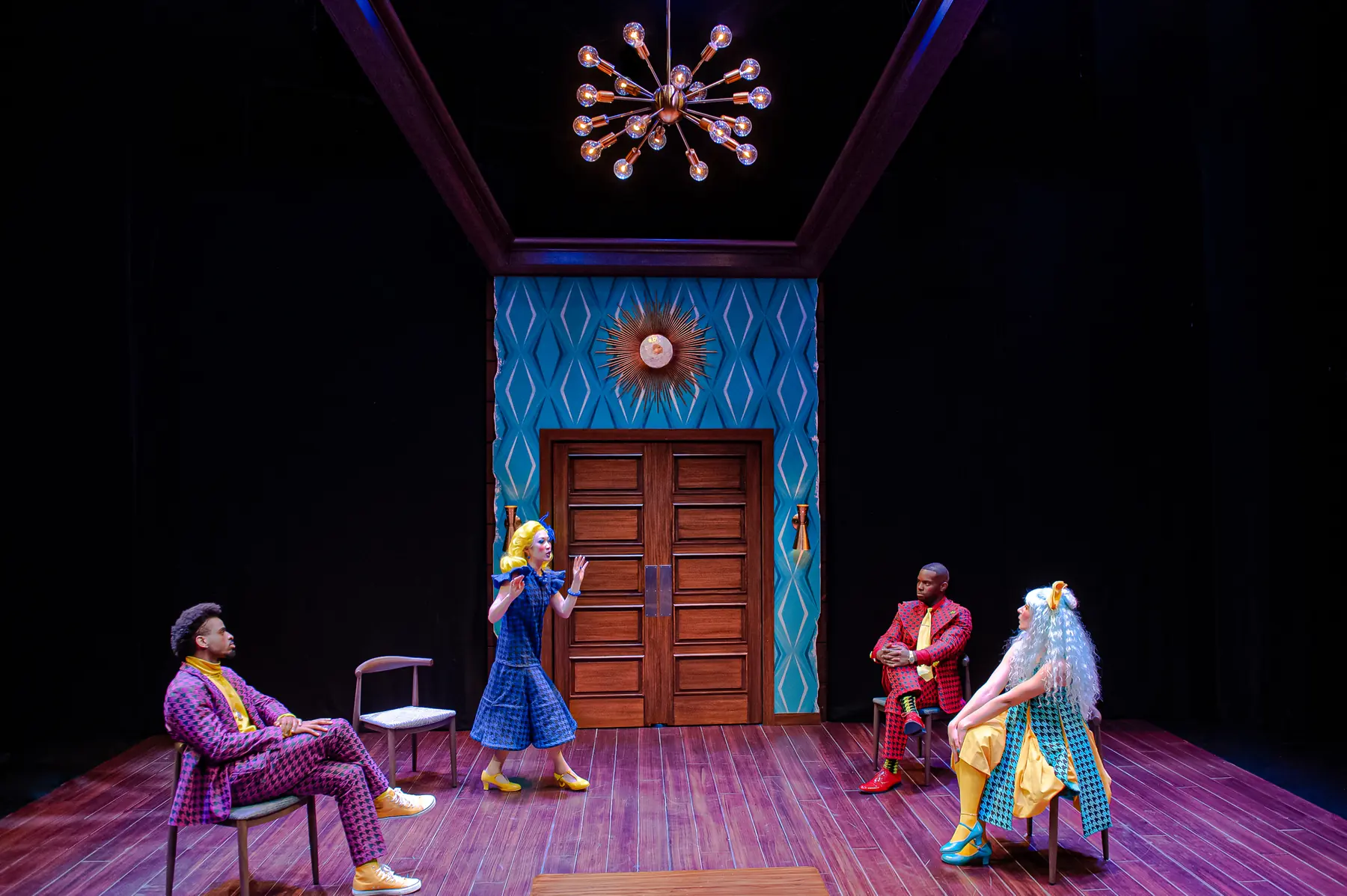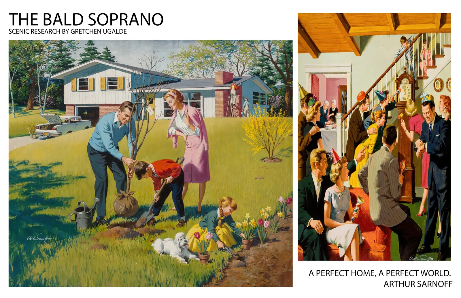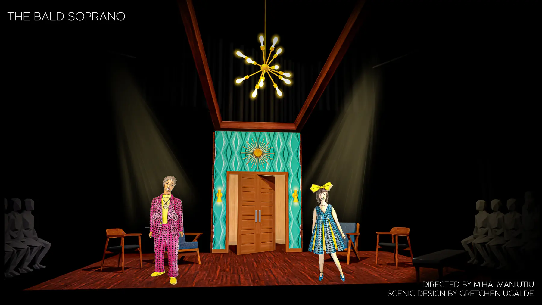 The Bald Soprano reimagines a polished mid-century American dream interior, layering theatrical absurdity into a seemingly familiar domestic world.
