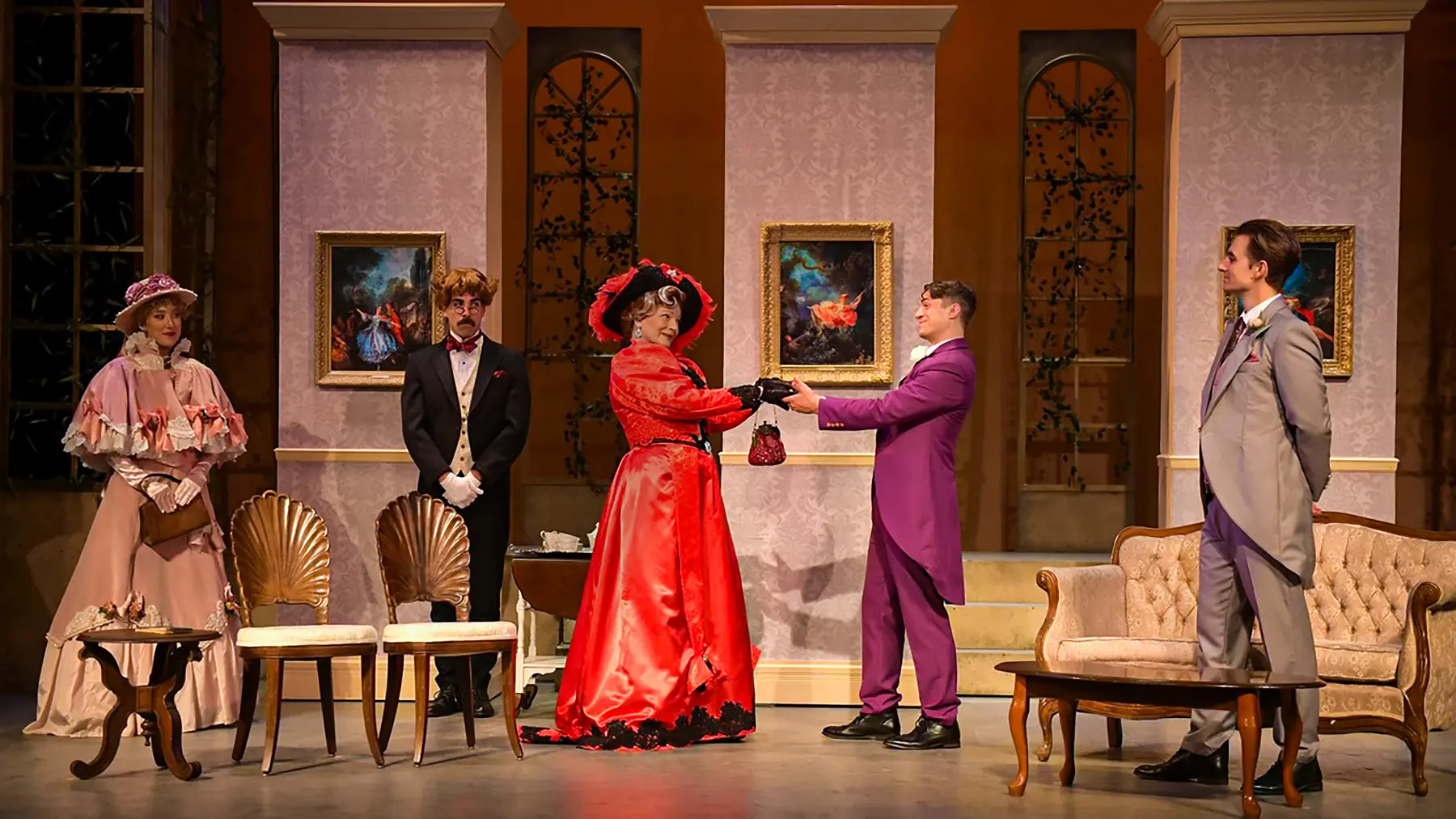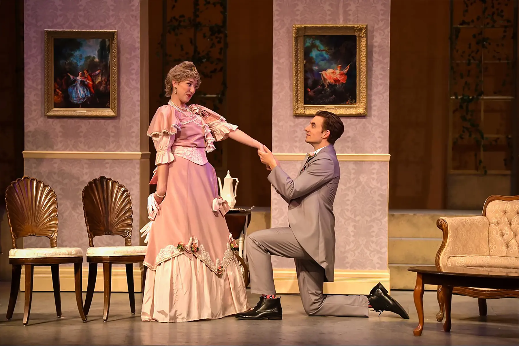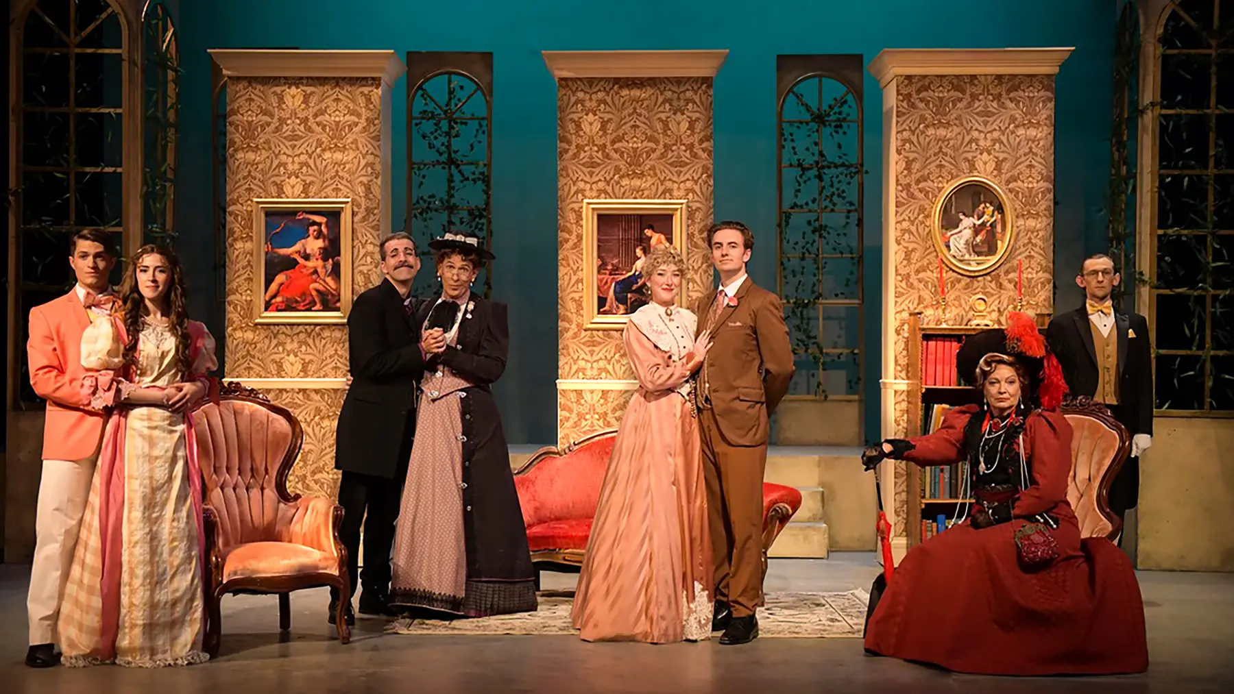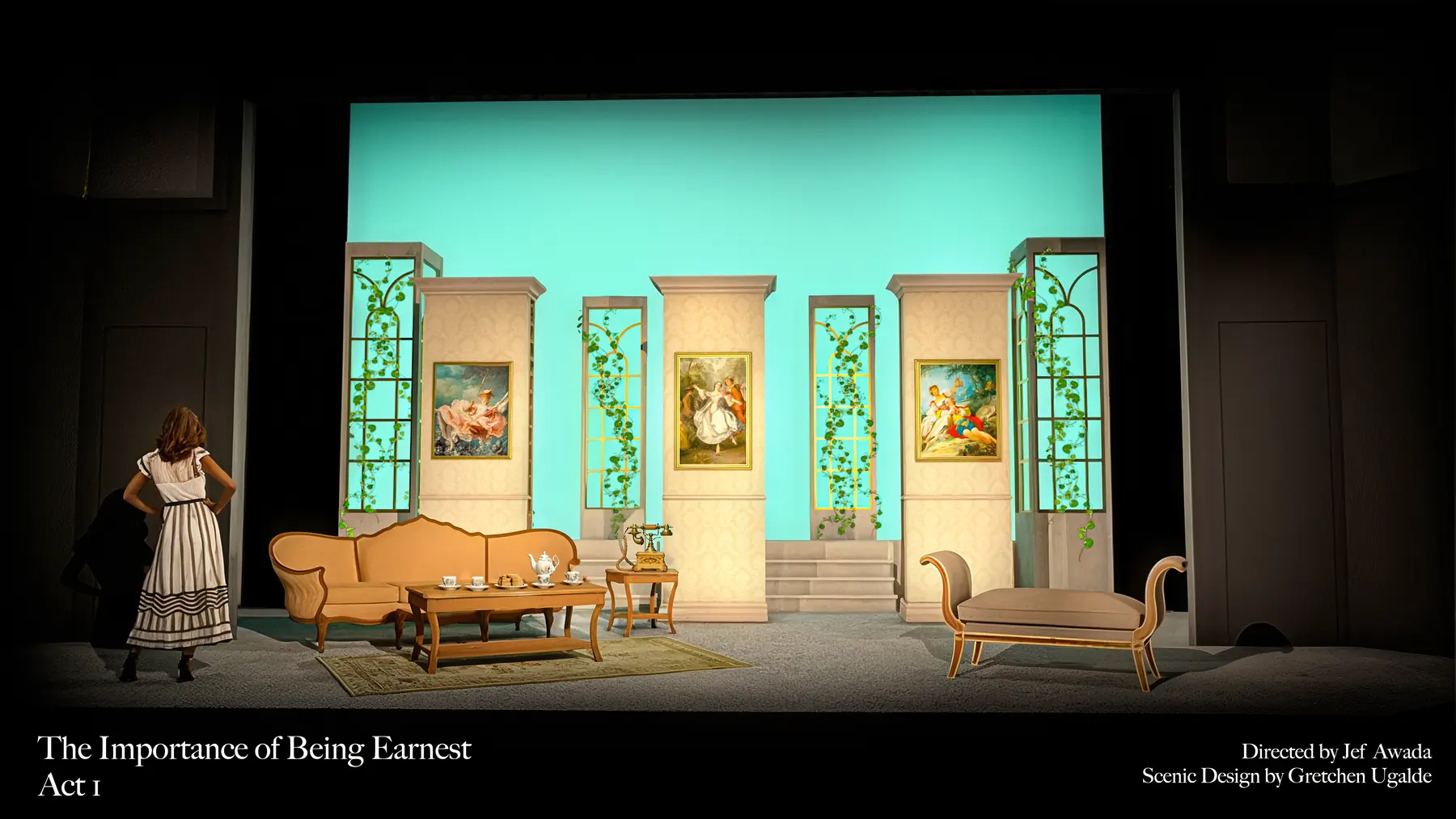 The Importance of Being Earnest balances precision, wit, and theatrical elegance, and Gretchen Ugalde's design supports that world with a polished period setting built for fast entrances, social comedy, and sharply framed stage pictures. The production photography captures that mix of refinement and playful rhythm across the Maples Repertory Theatre staging.