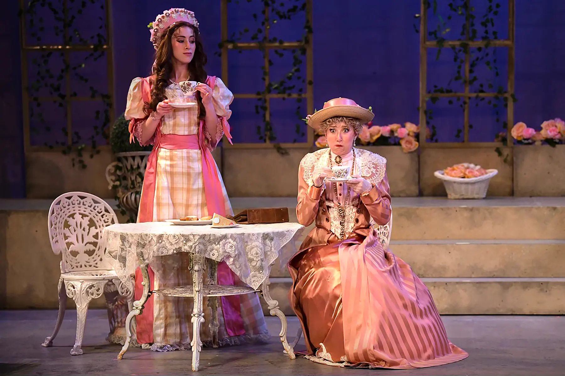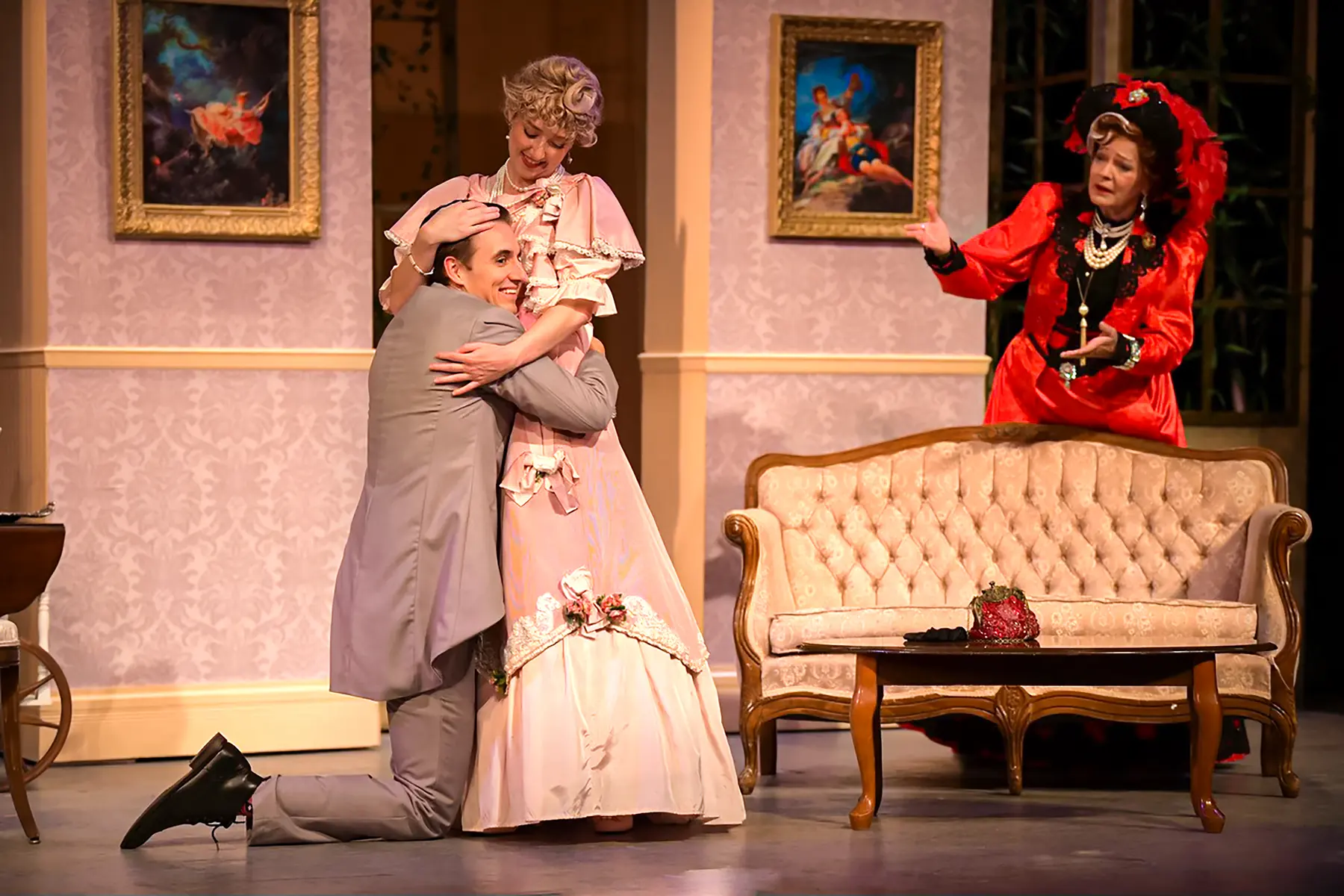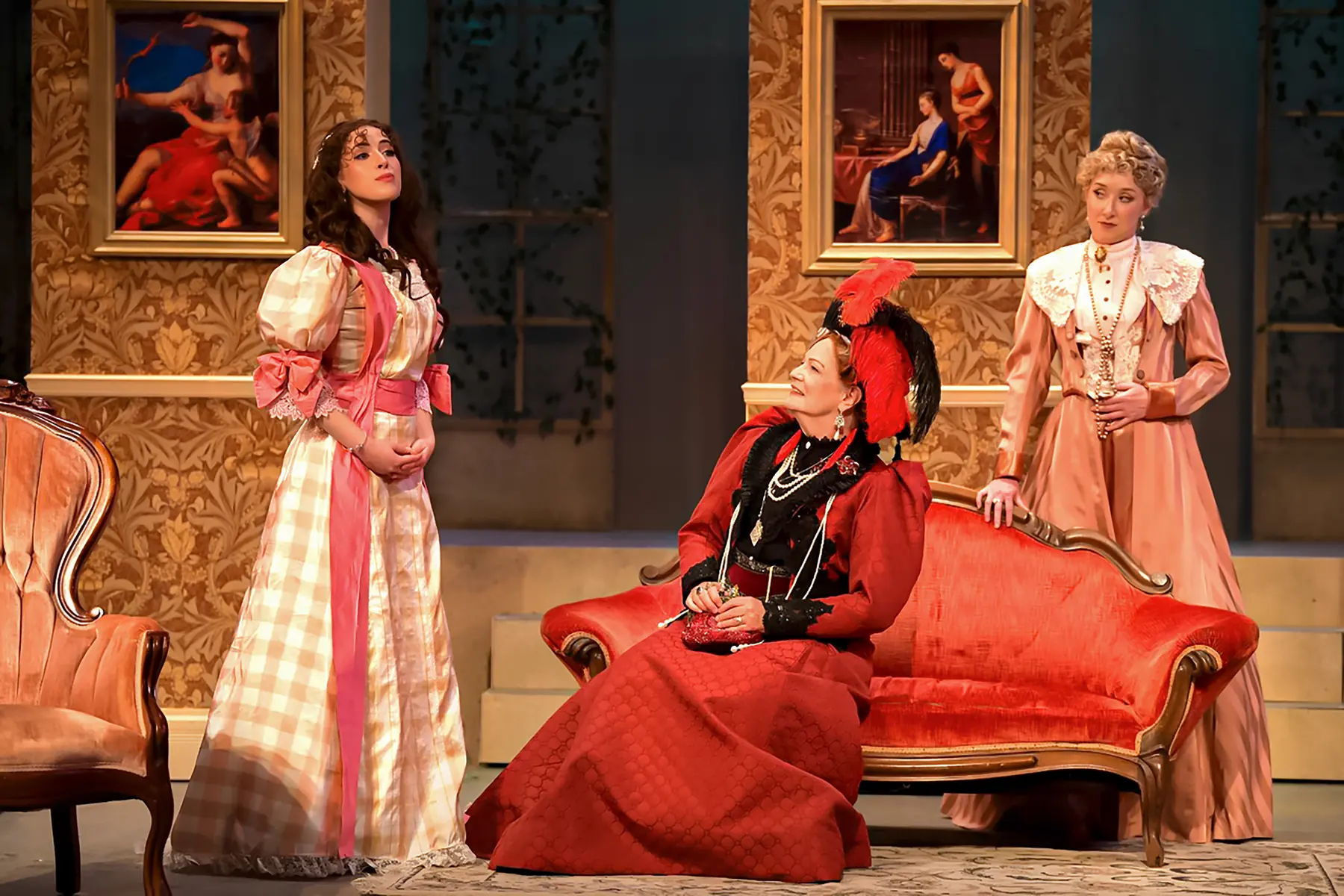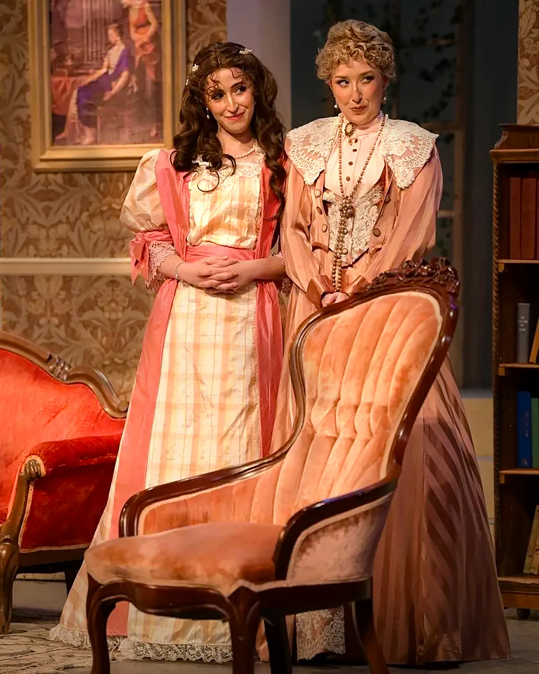 The Importance of Being Earnest balances precision, wit, and theatrical elegance, and Gretchen Ugalde's design supports that world with a polished period setting built for fast entrances, social comedy, and sharply framed stage pictures. The production photography captures that mix of refinement and playful rhythm across the Maples Repertory Theatre staging.